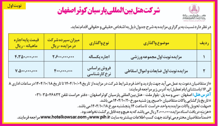 آگهی مزایده هتل بین المللی پارسیان کوثر اصفهان