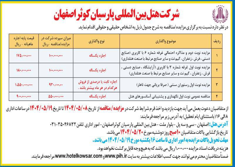 مزایده-مناقصه شرکت هتل بین المللی پارسیان کوثر اصفهان