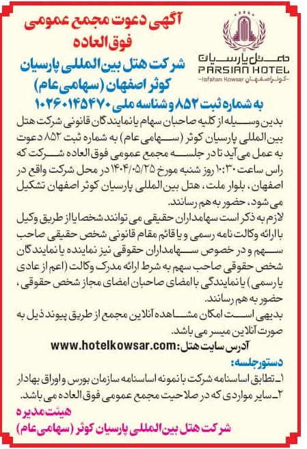 آگهی دعوت مجمع عمومی فوق العاده شرکت هتل بین المللی پارسیان کوثر اصفهان